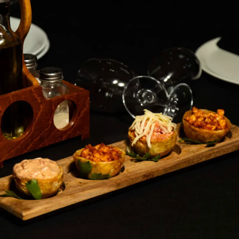 Tostones rellenos de varios agregados, camarón, jamón, queso y atún.