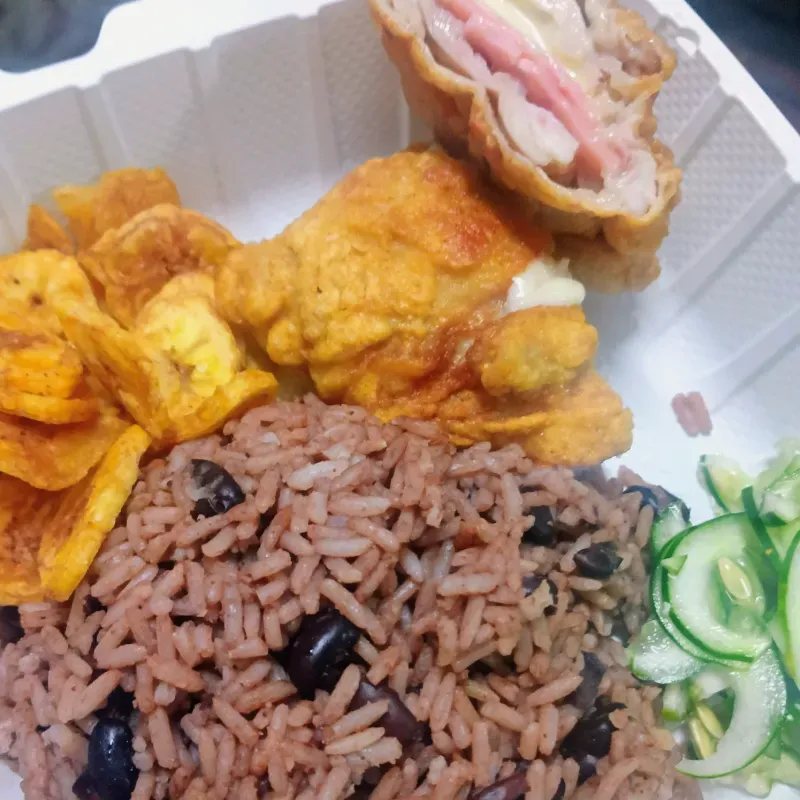 Bistec de pollo empanado con queso gouda y jamón.