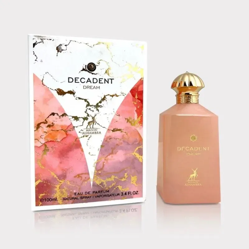 Decadent Dream de Maison Alhambra es una fragancia de la familia olfativa Oriental Floral para Hombres y Mujeres. Esta fragrancia es nueva. Decadent Dream se lanzó en 2025. Las Notas de Salida son pera, avellana y incienso de olíbano (franquincienso); las Notas de Corazón son osmanto (olivo oloroso), jazmín sambac (sampaguita), rosa y azafrán; las Notas de Fondo son sándalo, ládano, vainilla y ámbar gris.