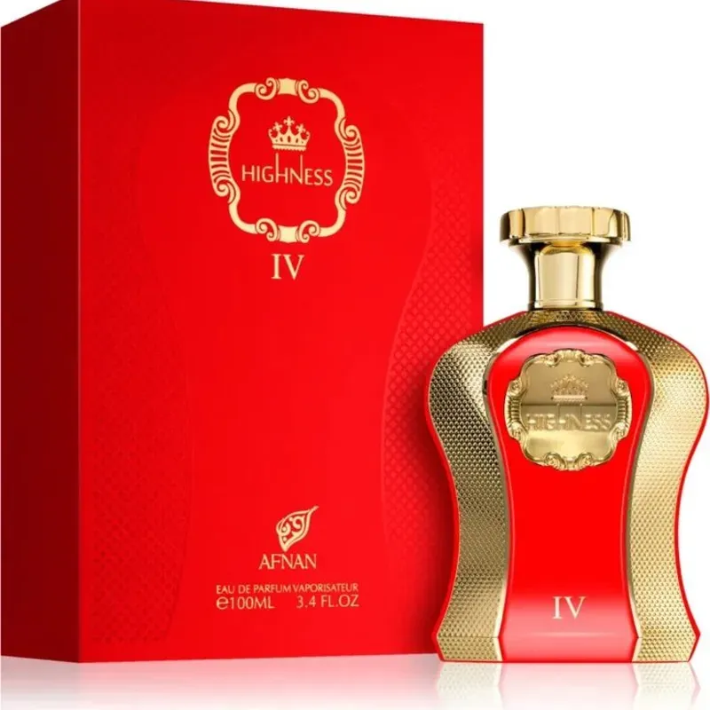 Highness IV de Afnan es una fragancia de la familia olfativa Oriental Vainilla para Mujeres. Highness IV se lanzó en 2021. Las Notas de Salida son rosa, azafrán y bergamota; las Notas de Corazón son madera de oud, sándalo y pachulí; las Notas de Fondo son almizcle, ámbar y vainilla.