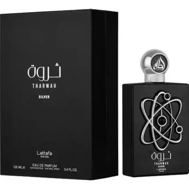 Tharwah Silver de Lattafa Perfumes es una fragancia de la familia olfativa Amaderada Acuática para Hombres. Tharwah Silver se lanzó en 2022. Las Notas de Salida son menta y bergamota; las Notas de Corazón son esclarea y lavanda; las Notas de Fondo son vetiver, cedro y almizcle.