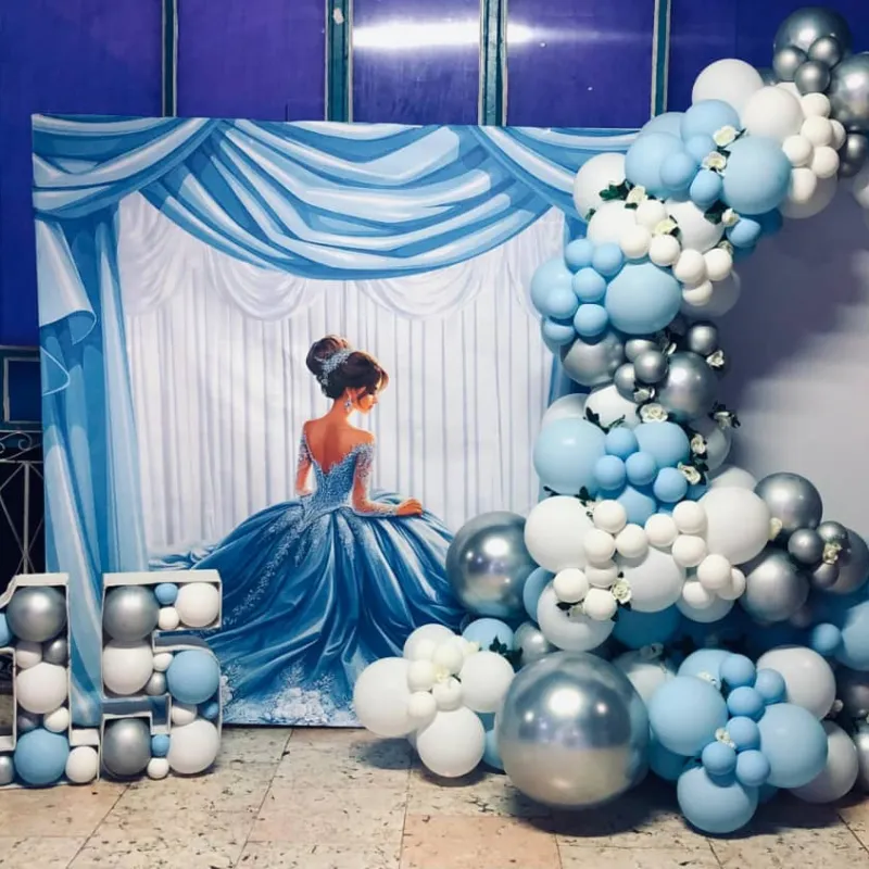 ✔️ Decoración temática con 600 globos ✔️ Póster personalizado ✔️ Flores artificiales decorativas para el arco ✔️ Cartel de Bienvenidos a Nuestra Boda / Bouquet de globos 15 años ✔️Juego de cilindros de acrílico / Mantel para decorar la mesa principal