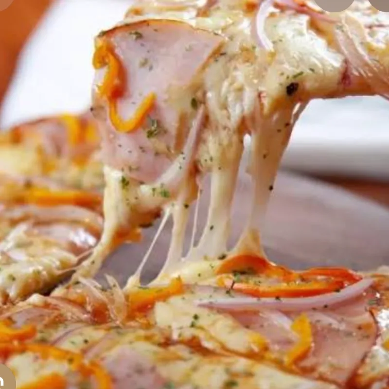 Deliciosa pizza con salsa de tomate ,queso blanco y finas lascas de lomo ahumado.
