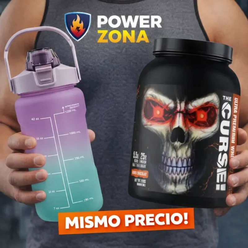 🟣 Botella motivacional + 🖤 Whey “The Curse!”
