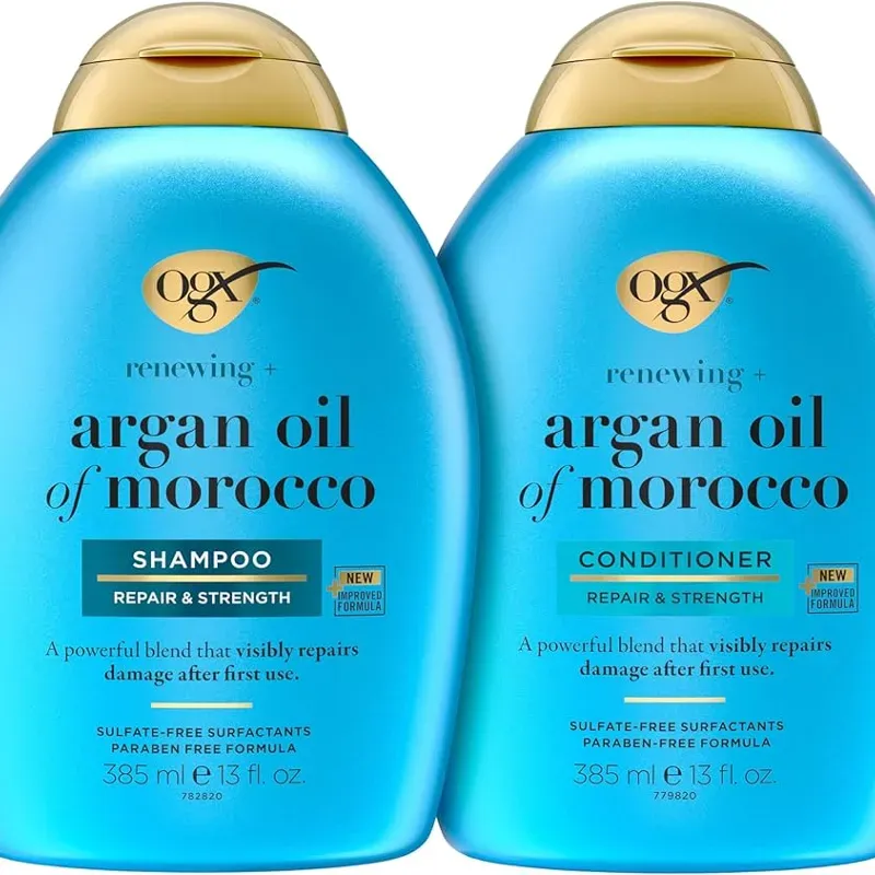 Ogx Shampoo y Acondicionador renovador con aceite de Argán de Marrueco repara el cabello dañado y seco y le da un aspecto y sensación de perfección sedosa para un cabello saludable en un solo lavado.