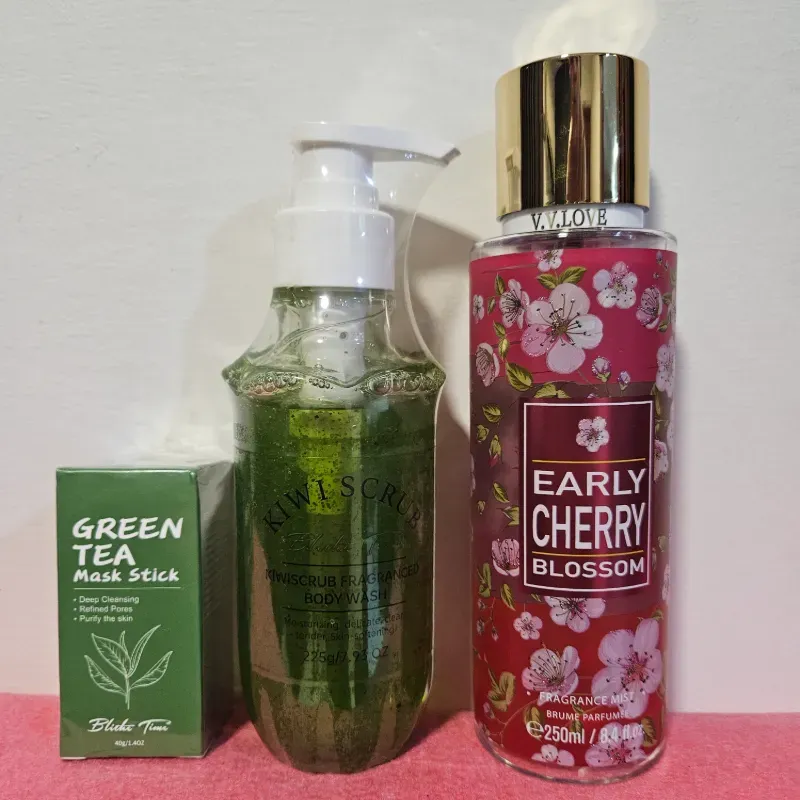 Gel exfoliante corporal, mascarilla facial de te verde y colonia