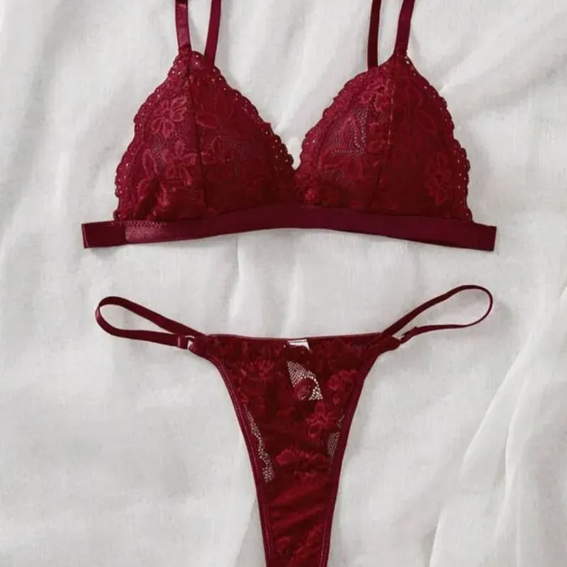 Conjunto de lencería sexy para mujer con blusa de encaje con tirantes finos y espalda descubierta y braga tipo g-string Burdeos/M