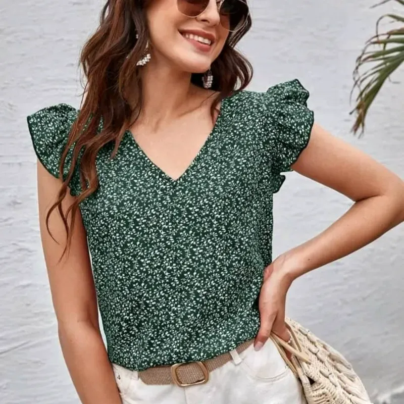 Top con estampado de plantas escote V Talla L Precio 11 usd o al cambio