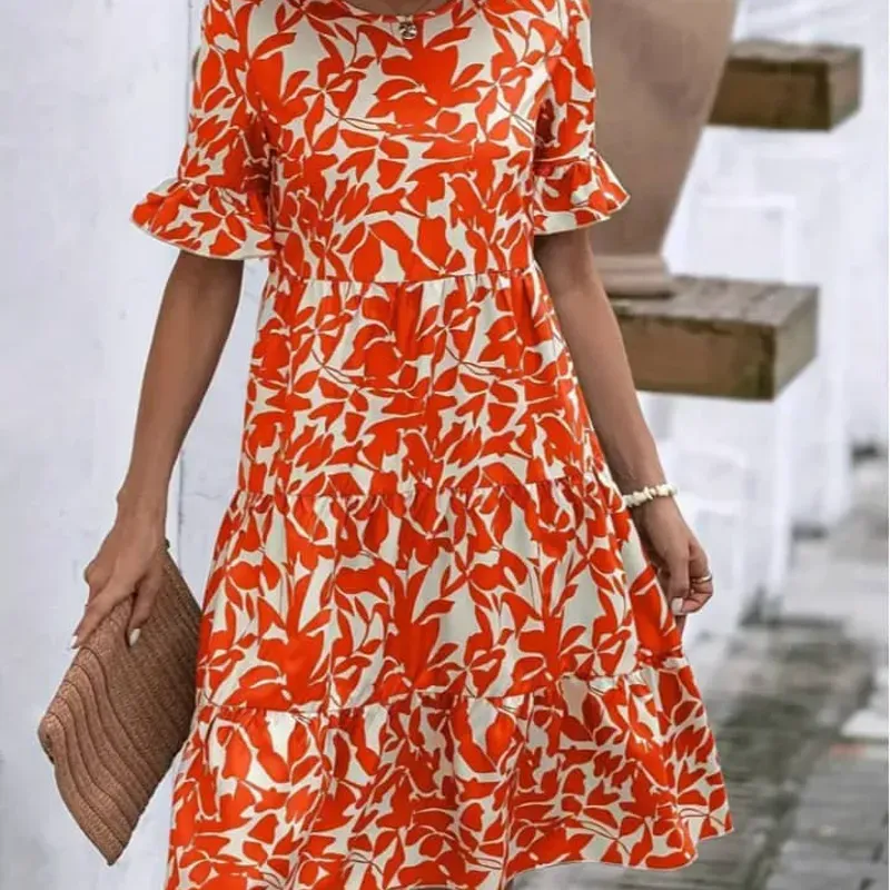 Encantador vestido de verano, con cuello redondo suave, coqueto dobladillo con volantes, para primavera y verano!! Talla S!! 16 USD o al cambio!!