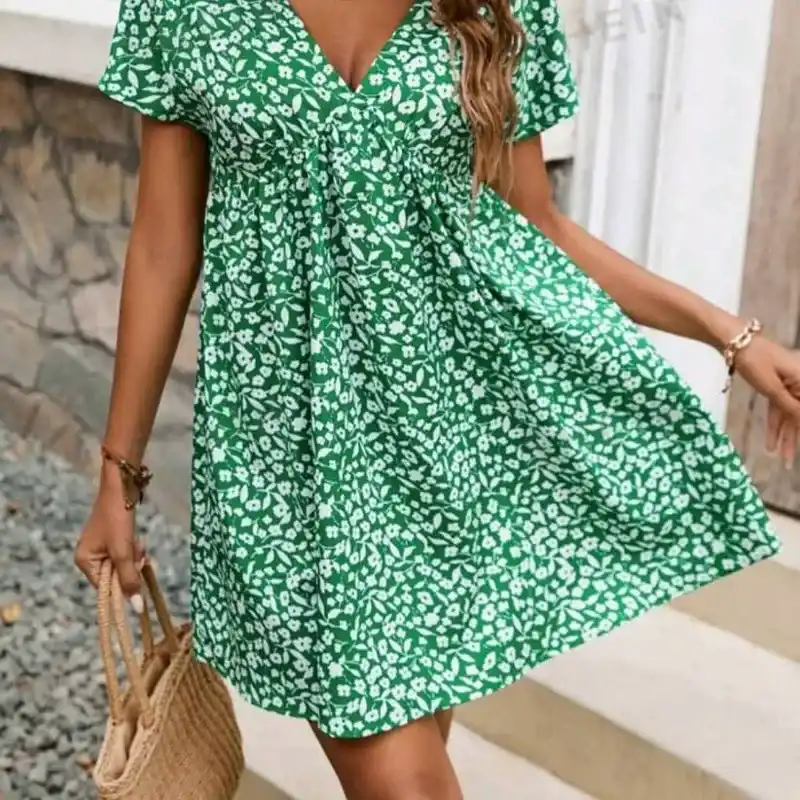 Vestido Estampado Con Flores, Cuello En V, Cintura Con Lazo, Vestido De Verano Casual, Vestido Floral Verde Verde/L
