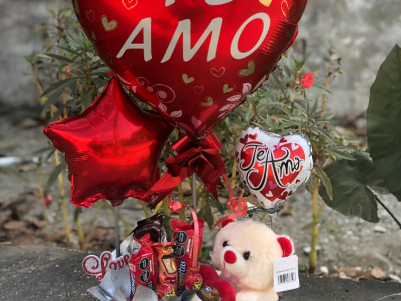 Confeccionado con cartón y foami, con peluche, confituras y globos.
