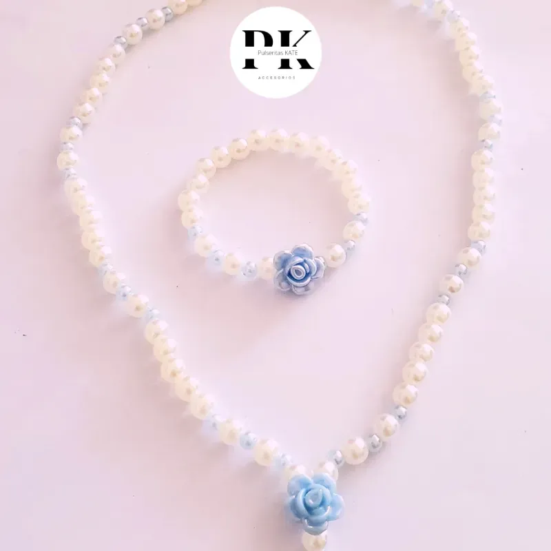 JUEGO DE COLLAR Y PULSERA DE PERLAS 6MM CON FLOR AZUL.