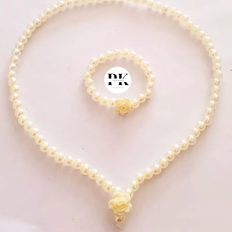 JUEGO DE COLLAR Y PULSERA DE PERLAS 6MM CON FLOR BLANCA.