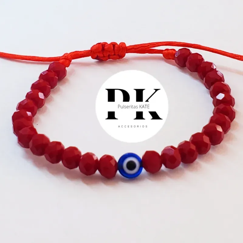 PULSERA DE SWAROVSKI 6MM ROJO CON OJO TURCO AZUL.