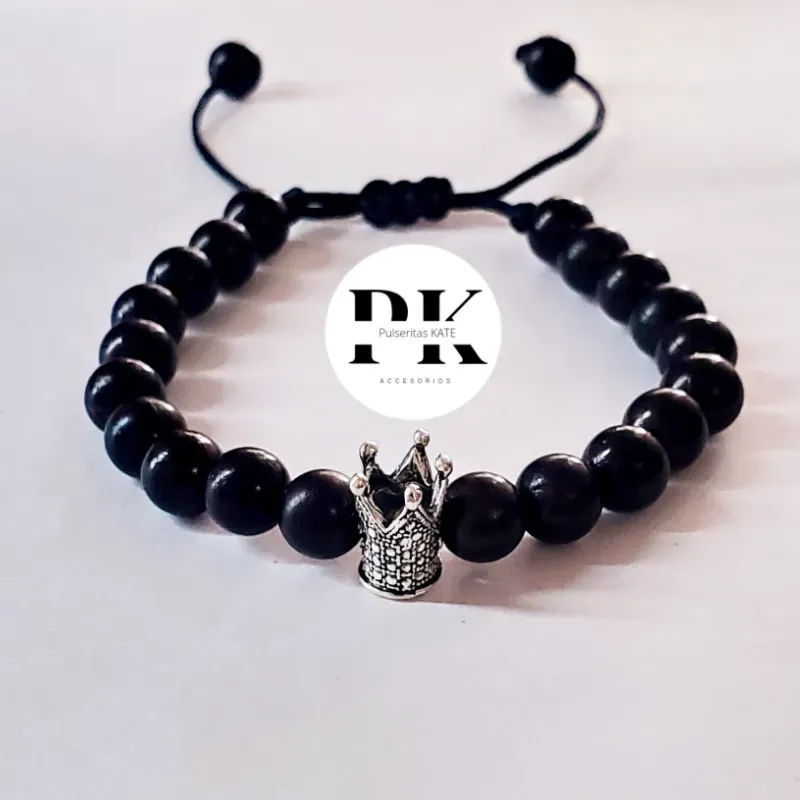 PULSERA DE PERLAS NEGRAS 8MM CON CONECTOR DE CORONA.