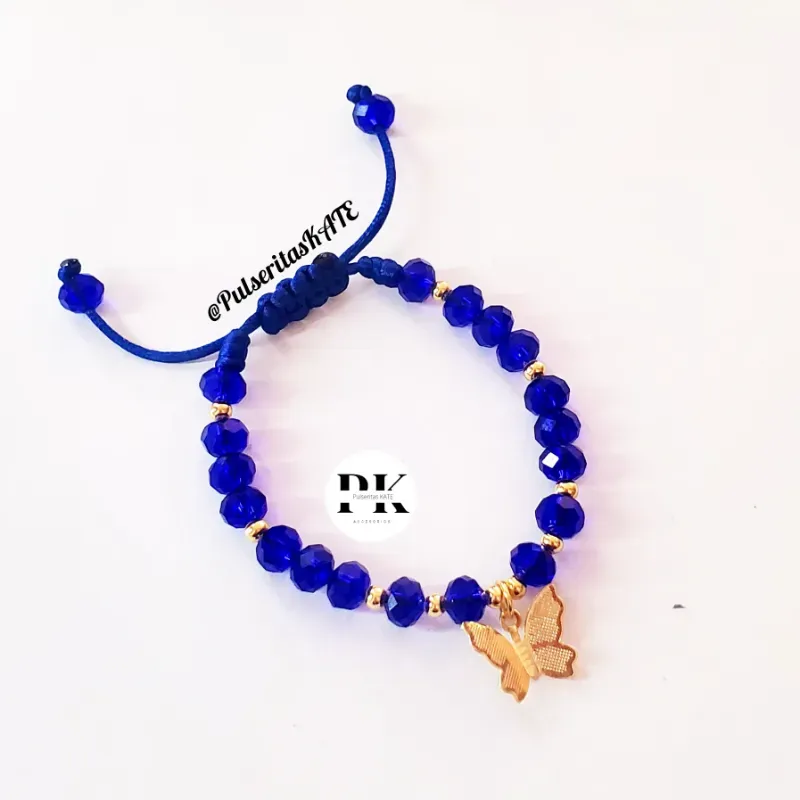 PULSERA DE SWAROVSKI 6MM AZUL CON BALINES DE CHAPA DE ORO 14K Y DIJE DE MARIPOSA DE CHAPA DE ORO 14K