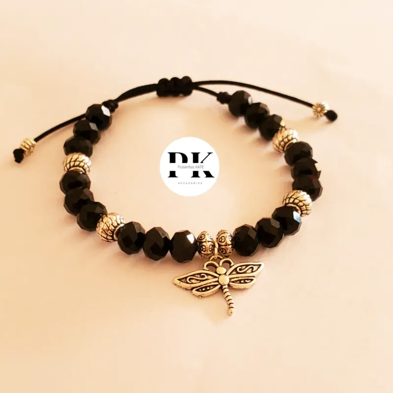 PULSERA DE SWAROVSKI 8MM NEGRA CON SEPARADORES Y DIJE DE LIBÉLULA.