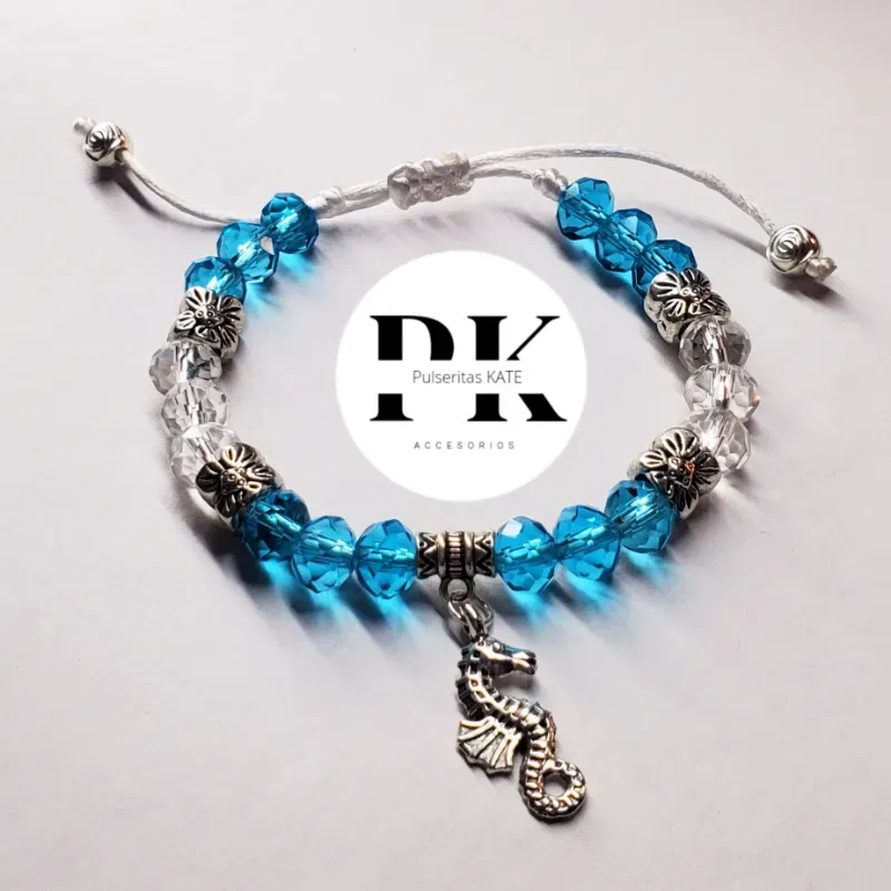 PULSERA DE SWAROVSKI 8MM AZUL Y TRANSPARENTE CON SEPARADORES Y DIJE DE CABALLITO DE MAR.