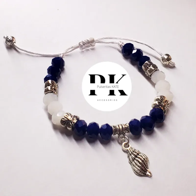 PULSERA DE SWAROVSKI 8MM AZUL Y BLANCO CON SEPARADORES Y DIJE DE CARACOLA.
