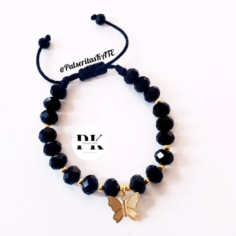 PULSERA DE SWAROVSKI 8MM NEGRA CON BALINES DE CHAPA DE ORO 14K Y DIJE DE MARIPOSA DE CHAPA DE ORO 14K