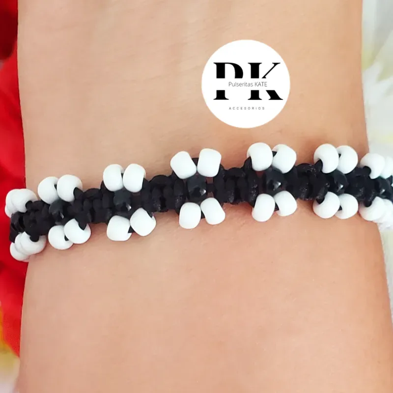 PULSERA TEJIDA CON CUENTAS BLANCAS Y NEGRAS.