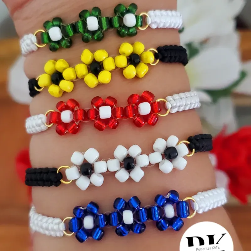 PULSERA TEJIDA CON NUDO MACRAMÉ CON FLORES...(VARIEDAD DE COLORES).