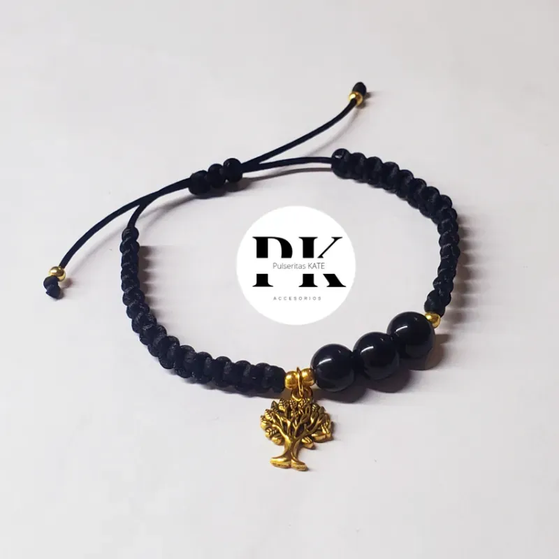 PULSERA TEJIDA CON NUDO MACRAMÉ NEGRA CON ONIX NEGRO DE BRILLO 8MM Y DIJE DEL ÁRBOL DE LA VIDA DE CHAPA DE ORO 14K Y BALINES DE CHAPA DE ORO 14K.