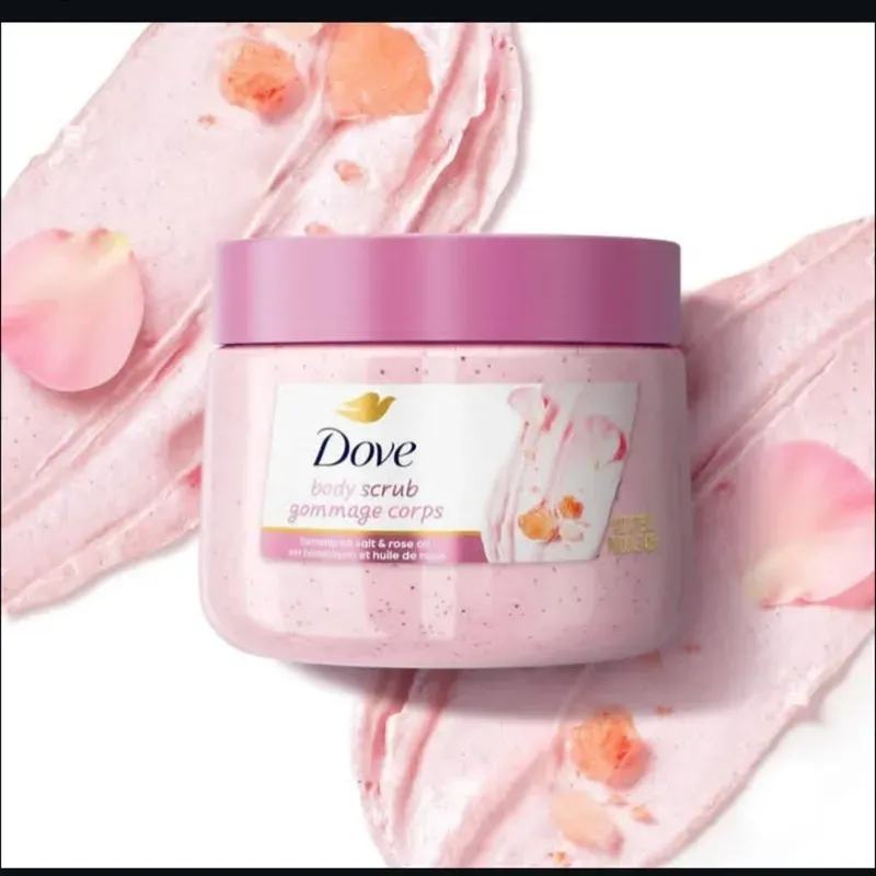 El producto de la imagen es el exfoliante corporal de sal del Himalaya y aceite de rosa de Dove. Es un exfoliante suave que ayuda a nutrir y restaurar los nutrientes naturales de la piel.