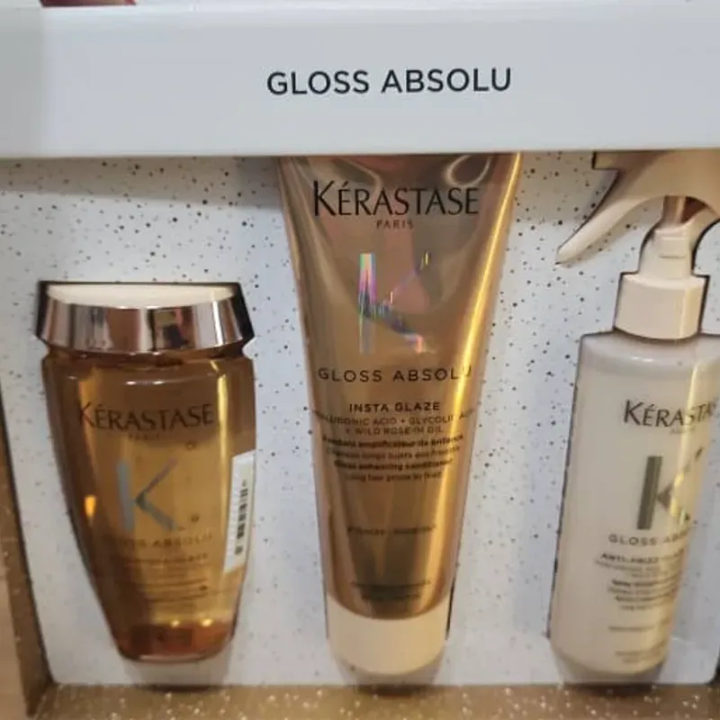 Este es un set de productos Kérastase Gloss Absolu que incluye champú, un tratamiento y un spray antiencrespamiento. El set está diseñado para cabello largo y propenso al encrespamiento. Los productos contienen ácido hialurónico, ácido glicólico y aceite de rosa mosqueta. El champú (izquierda) limpia e hidrata el cabello para un acabado suave y brillante. El tratamiento Insta Glaze (centro) ayuda a alinear la fibra capilar para un acabado pulido. El spray (derecha) desenreda, hidrata y protege del calor.