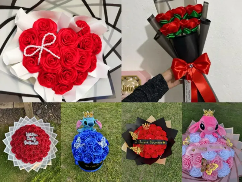 Cantidad de rosas a elección del cliente Gorra personalizada con lo que el cliente elija Cinta con frase personalizada El precio varía según la cantidad de rosas