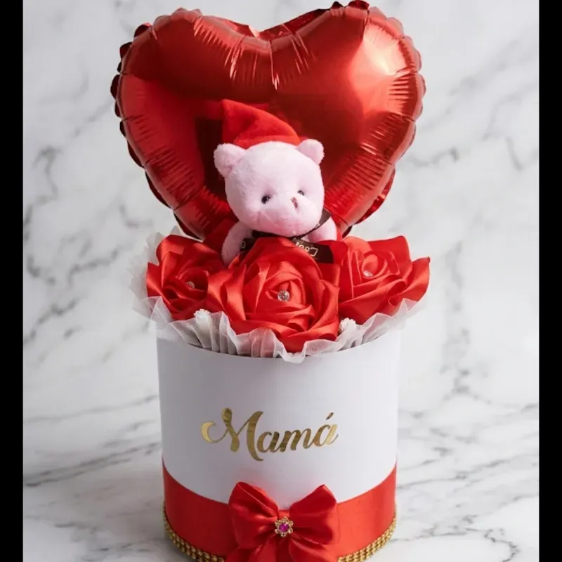 Caja cilíndrica con 3 rosas eternas y globo personalizado con la frase deseada. Oso pequeño