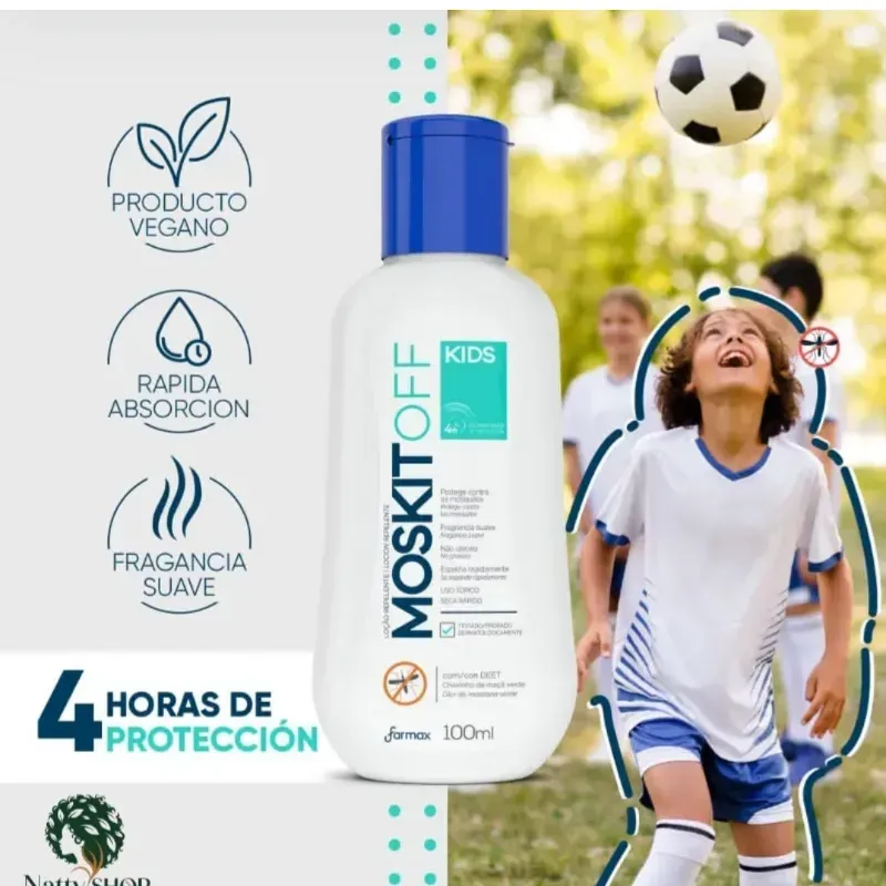 Loción Repelente Infantil con DEET Moskitoff protege la piel de los niños contra mosquitos, incluyendo los transmitidos por Aedes aegypti (dengue, fiebre amarilla, zika, chikunguña) y Culex quinquefasciatus (mosquitos, mosca negra).