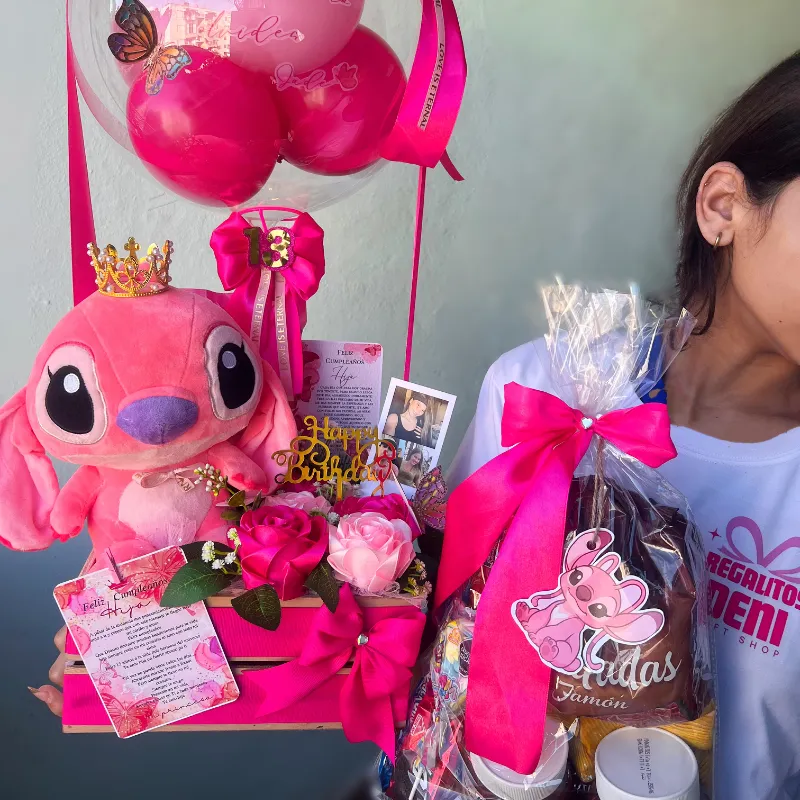 Contiene 6 rosas eternas , peluche de Angela con corona mediana de hierro , globo burbuja con letrero , caja decorada , 2 fotos , 2 postales , Java de chucherias , topper feliz cumpleaños , mariposas , Tull de brillo