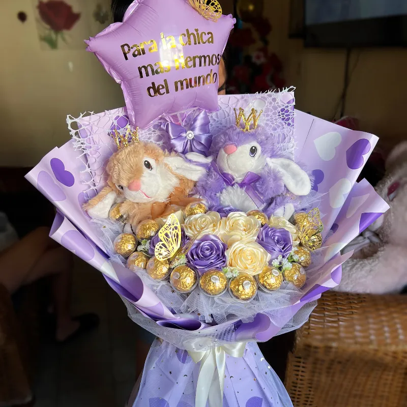 Contiene 9 rosas eternas con 16 bombones Ferrero Rocher y parejita de Peluchitos con sus coronas de hierro