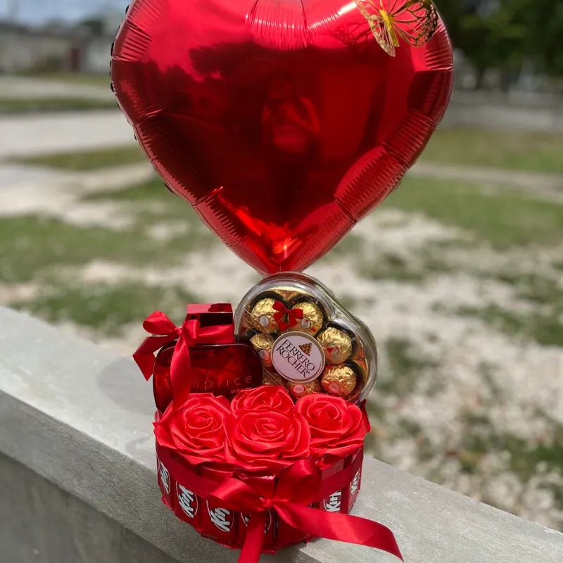 Caja de regalo con 18 barras de chocolate Kit Kat 🫠, perfume Cómplice y caja corazón de 8 Ferrero Rocher … adornada con rosas eternas y globo…