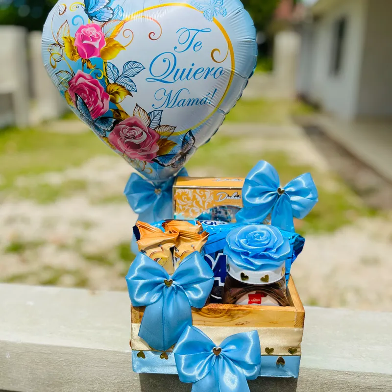 Cesta con globo dedicado a mamá, contiene set de colonia y crema, paquete de 8 paquetitos de galletas de chocolate, 4 galletas más grandes de vainilla y crema Nutela