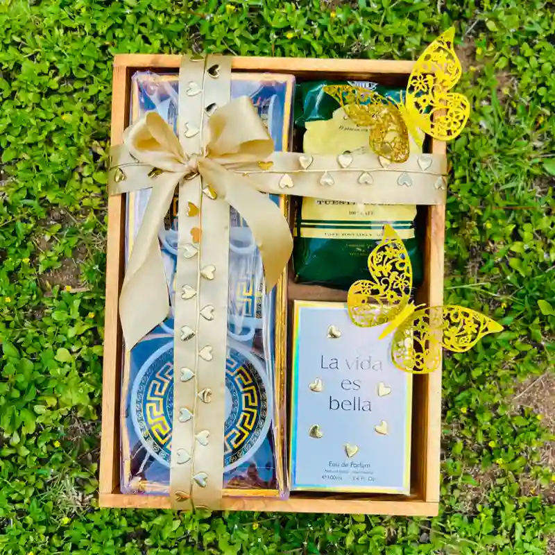 Contiene: juego de 6 tazas y platicos, paquete de café y perfume La vida es Bella