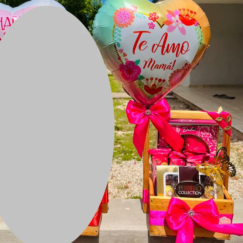 Cesta de madera adornada con globo para mamá, contiene set de colonia y crema, 4 paquetes de galletitas de fresa y caja de 12 Ferrero Rocher