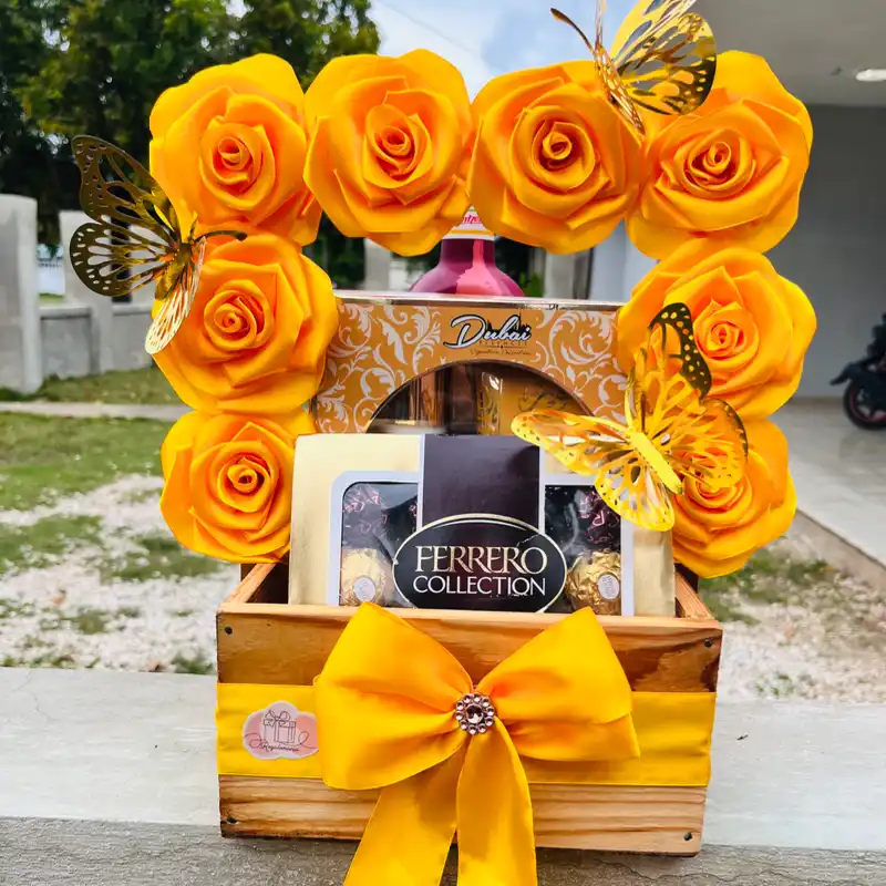 Cesta de madera adornada con rosas eternas, contiene caja de 12 Ferrero Rocher, set de Colonia y Crema y bebida de su preferencia..