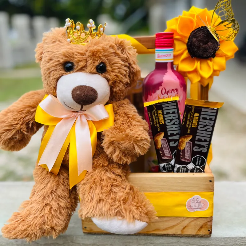 Cesta variada decorada con peluche, set de crema y colonia, bebida (crema) y 2 barras de chocolate Hersheys