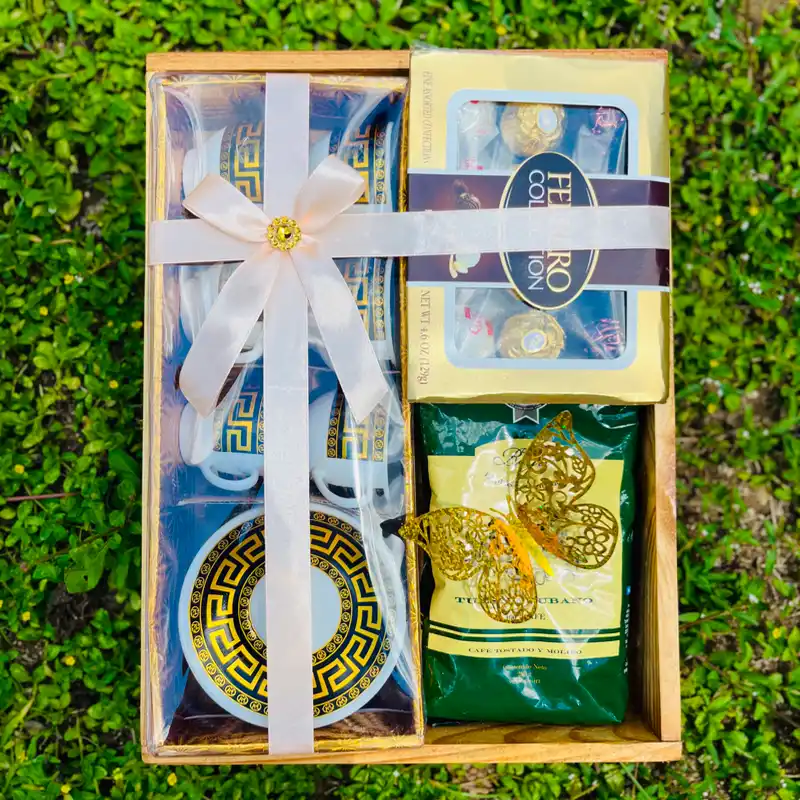 Contiene: juego de 6 tazas y platicos, paquete de café y caja de 12 bombones Ferrero Rocher dentro