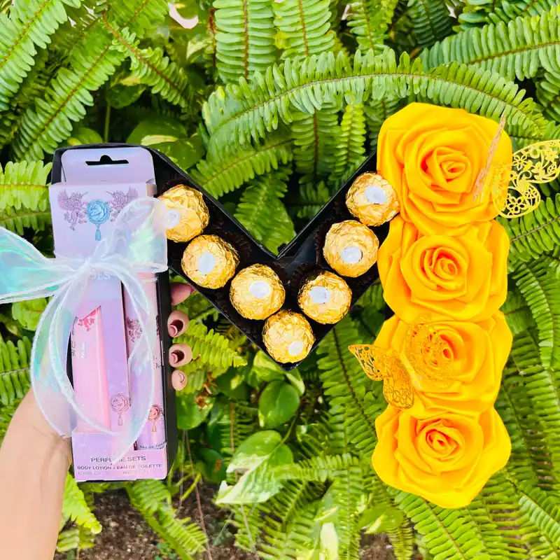 Cajita letra M con rosas eternas, 7 bombones Ferrero Rocher y set de perfume y crema..
