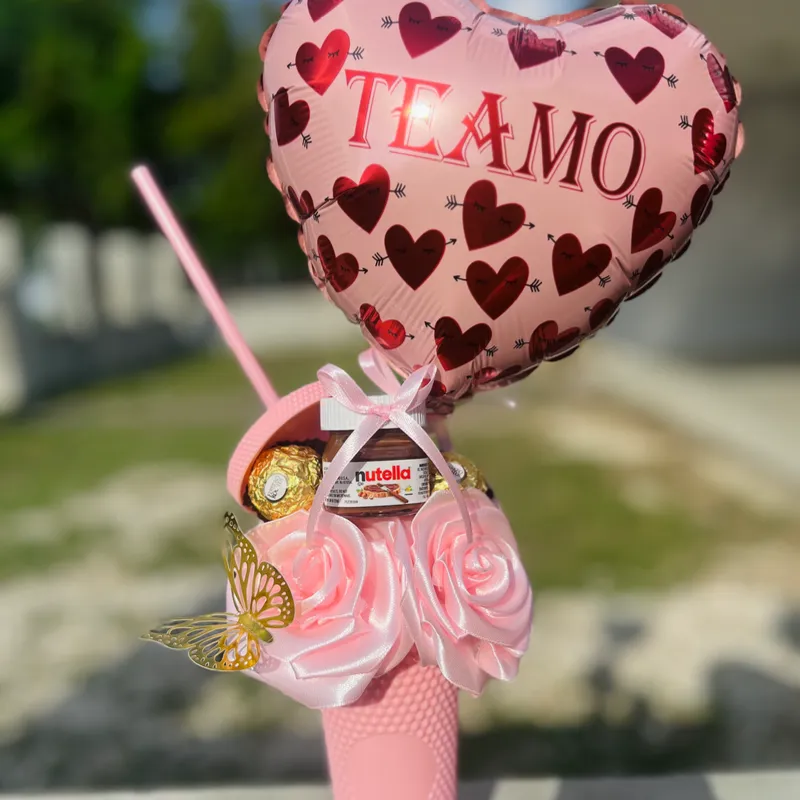 Vaso studded pequeño decorado con globo, rosas eternas, mini dosis de Nutela y 2 bombones Ferrero Rocher