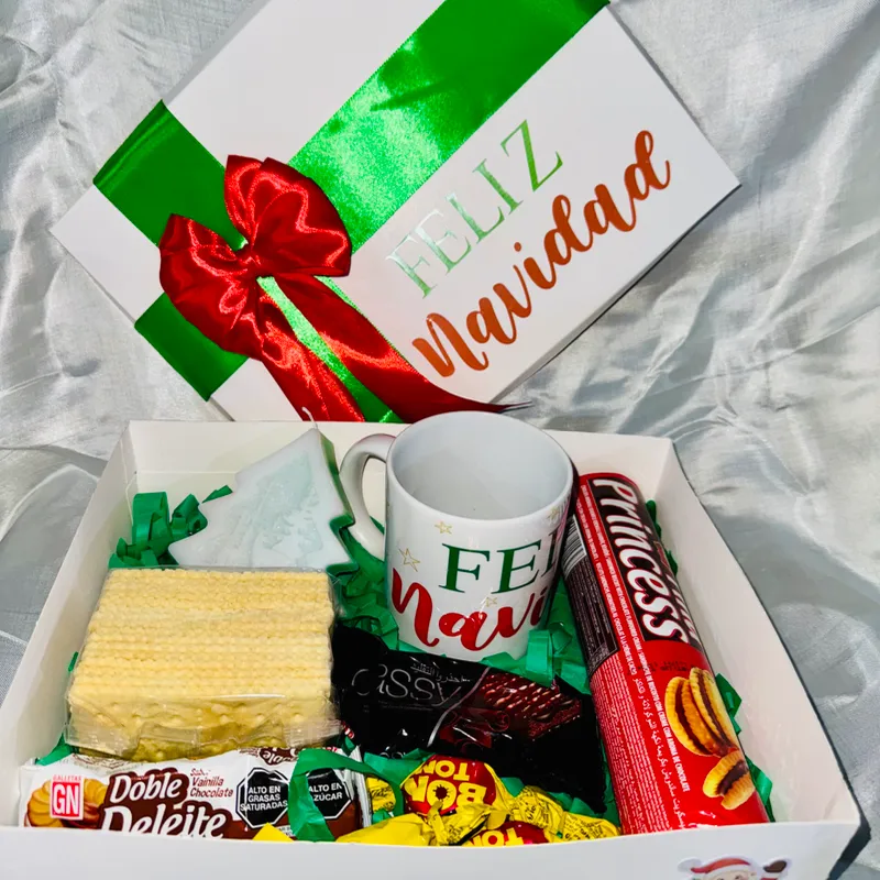 Caja navideña con chucherias, jarra temática y vela aromática
