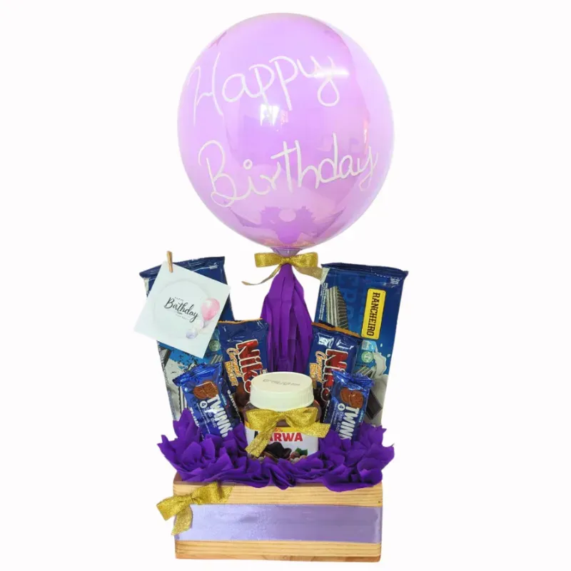 Incluye: 2 sorbetos 2 packs de barras de galletas cubiertas de chocolate y miel (X2) 2 galletas pequeñas 1 pote de crema de cacao Caja de madera 21x13x8 1 postal 1 globo burbuja personalizado con su portaglobos Decoración
