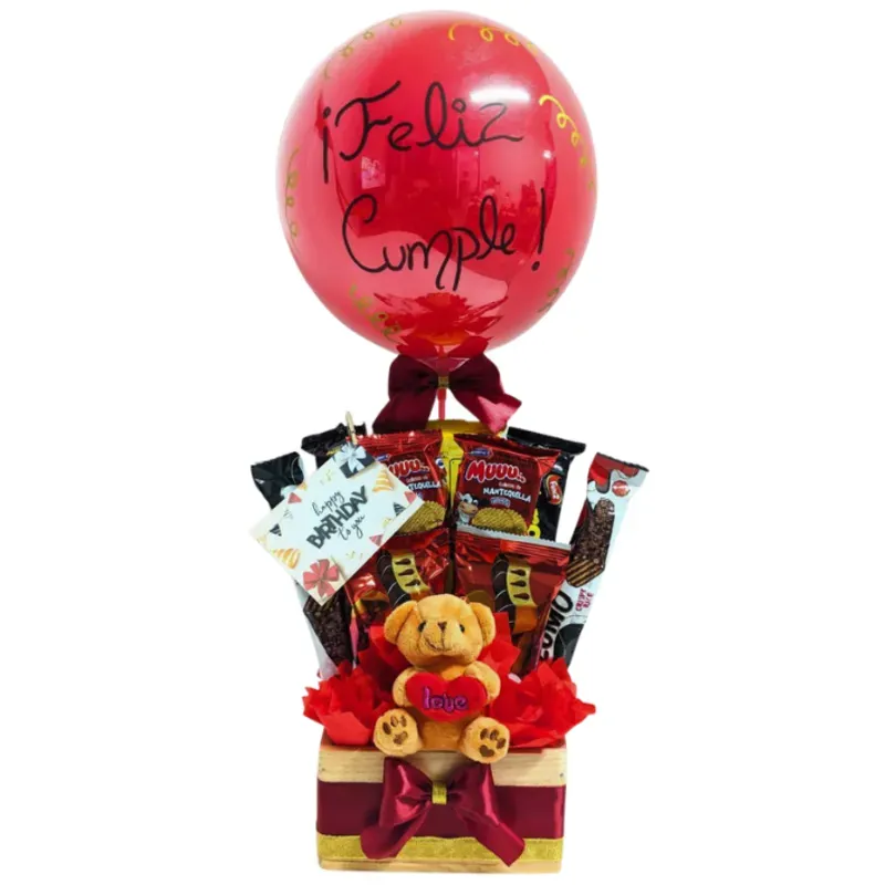 Incluye: 2 galletas grandes 2 galletas pequeñas 1 sorbeto 2 panques 2 barras de sorbeto cubierto de chocolate con arroz 1 peluche llavero 1 Globo burbuja personalizado con su portaglobos Caja de madera 16x11x8cm 1 postal Decoración