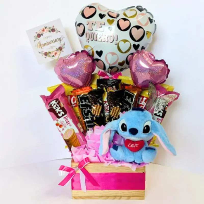 Incluye: 2 Paquetes de Papas 3 Panques 2 Packs de barras de galletas cubiertas de chocolate y miel 2 Barras de sorbeto cubierto de chocolate con arroz 1 Peluche llavero 3 Globos decorativos con sus portaglobos 1 Mariposa 1 Postal Caja de madera 16x11x8cm Decoración