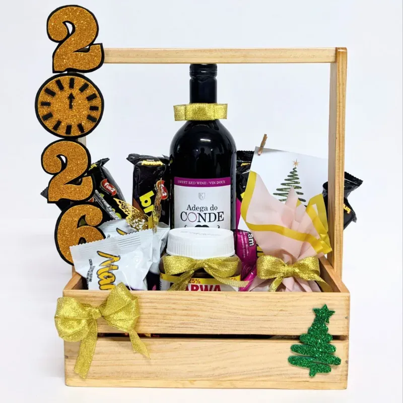 Incluye: 6 galletas grandes 1 pote de crema de cacao 2 panques 5 bombones con su envoltorio 1 botella de vino Caja tipo cesta de madera 25x16x8cm Cartel en foamy 2026 1 mariposa 1 postal Decoración