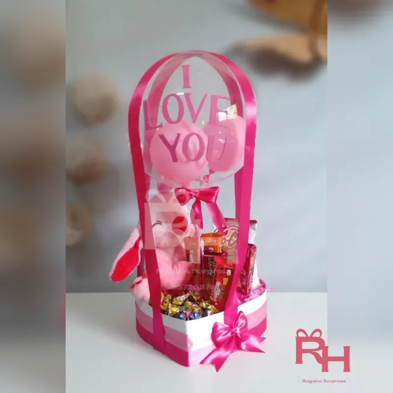 Incluye: 1 peluche a escoger de los disponibles en el momento del encargo 5 confituras variadas 1 paquete de papitas 15 bombones 1 globo burbuja con mensaje Decoración del color que desee