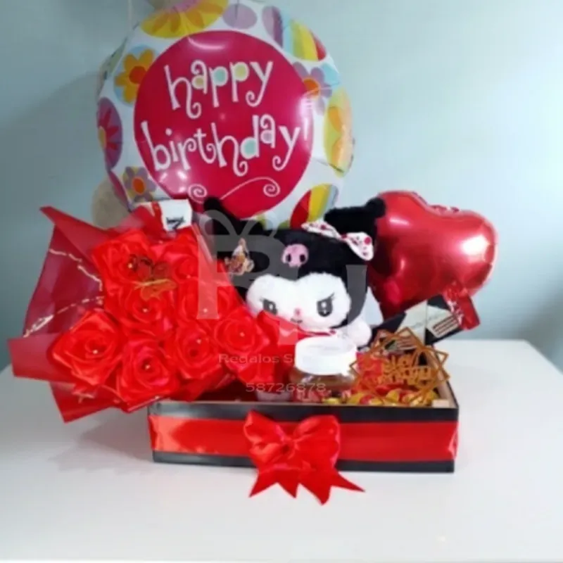 Incluye: 2 confituras 1 pomo de crema de chocolate 10 bombones Ramo de 8 rosas eternas 1 globo temático 1 globo de corazón pequeño Decoración del color que desee